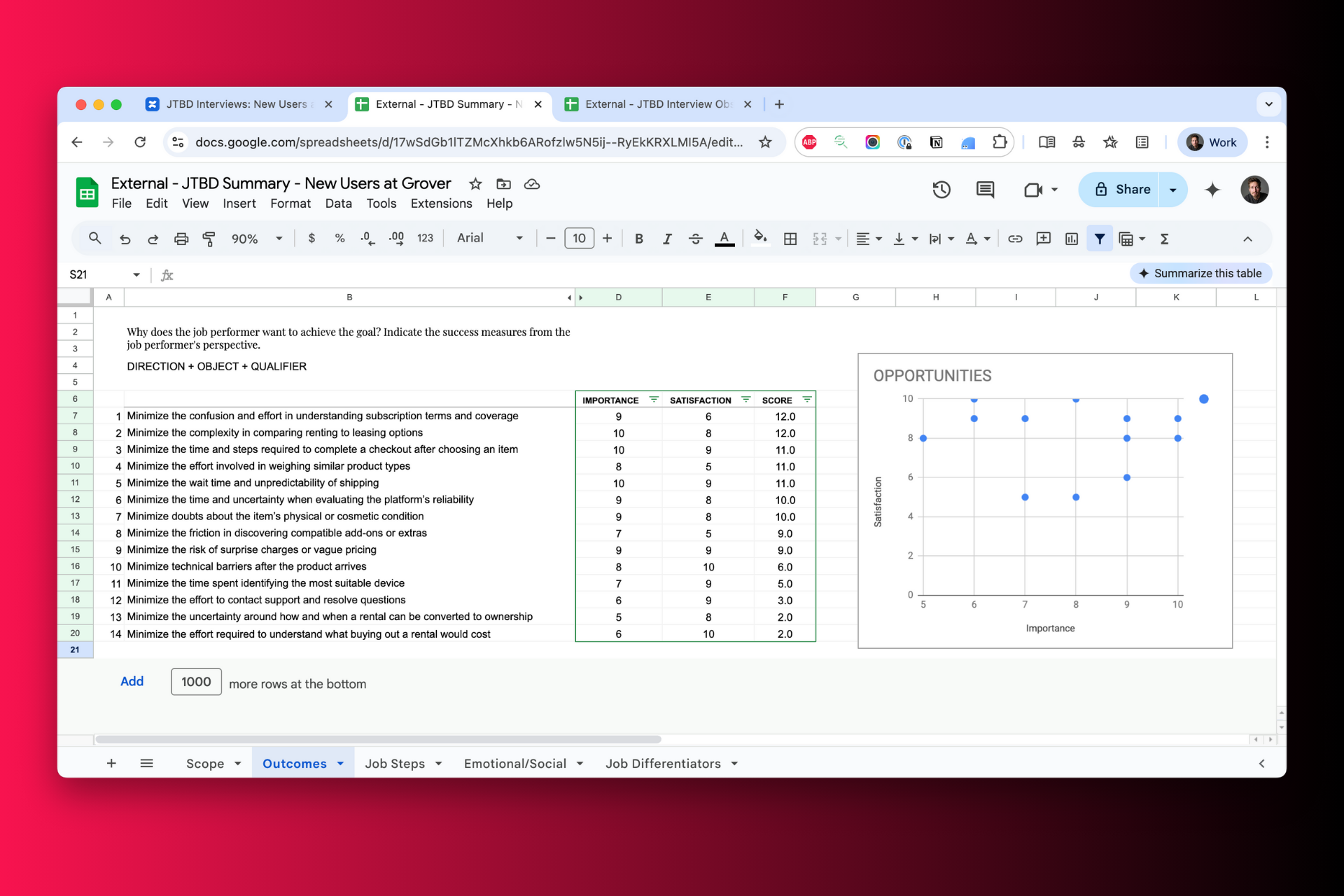 Next, we validated our findings through a structured survey. Each participant rated the extracted outcomes on two dimensions: importance and satisfaction. This helped us spot which jobs were critical but underserved, clear opportunities for product improvement.