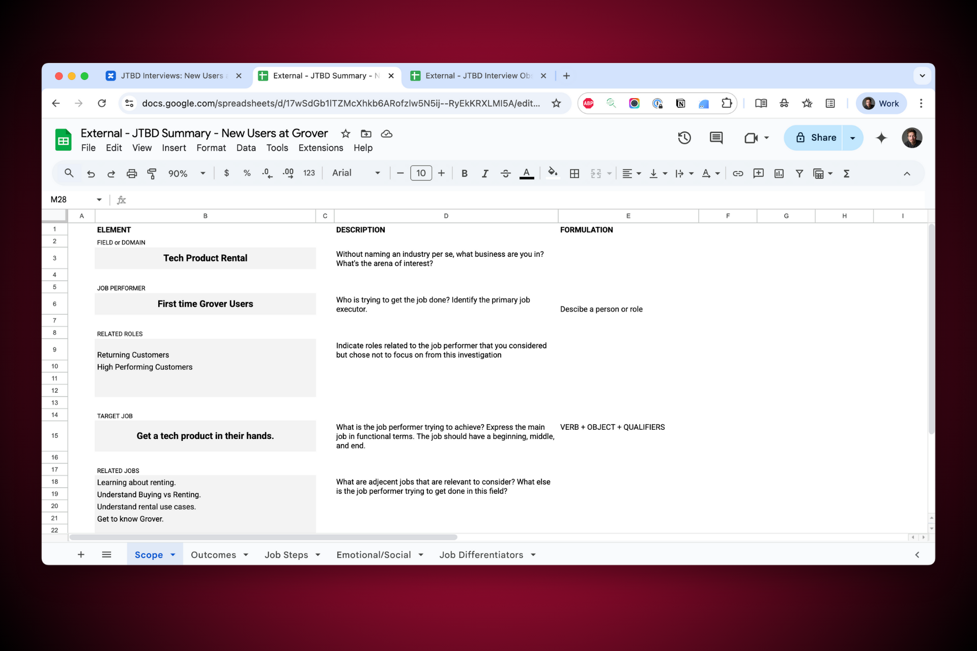 My goal was to apply the JTBD Canvas 2.0 framework to better understand new customers who recently placed their first rental. I wanted to identify where our experience supports them well, and more importantly, where it doesn’t. By having a list of Jobs, that have been verified by quantitative as well as qualitative research, we would have strong arguments for the business to set a direction and make decisions that I can use as a Product Lead. This research is intended to: Challenge internal assumptions with real user data. Support more impactful, user-centred experiments, especially on key surfaces like the homepage. Align efforts with Grover’s new brand strategy.